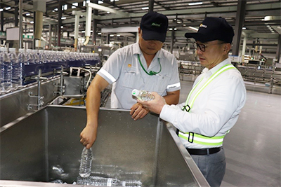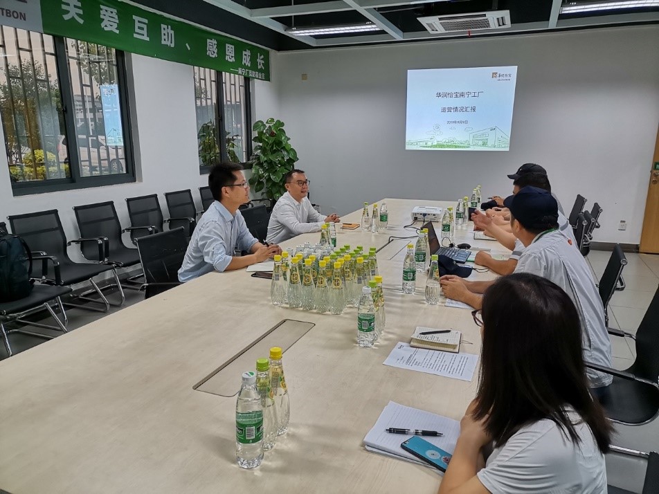 在怡宝南宁工厂调研期间,简总认真听取了南宁工厂业务发展、EHS管理、质量管理、成本管控、星级工厂建设等方面的工作汇报,针对员工福利、激励机制、精益管理、未来发展等具体事项进行了深入交流与指导;随后走进生产车间,现场对EHS相关工作进行了检查与指导。