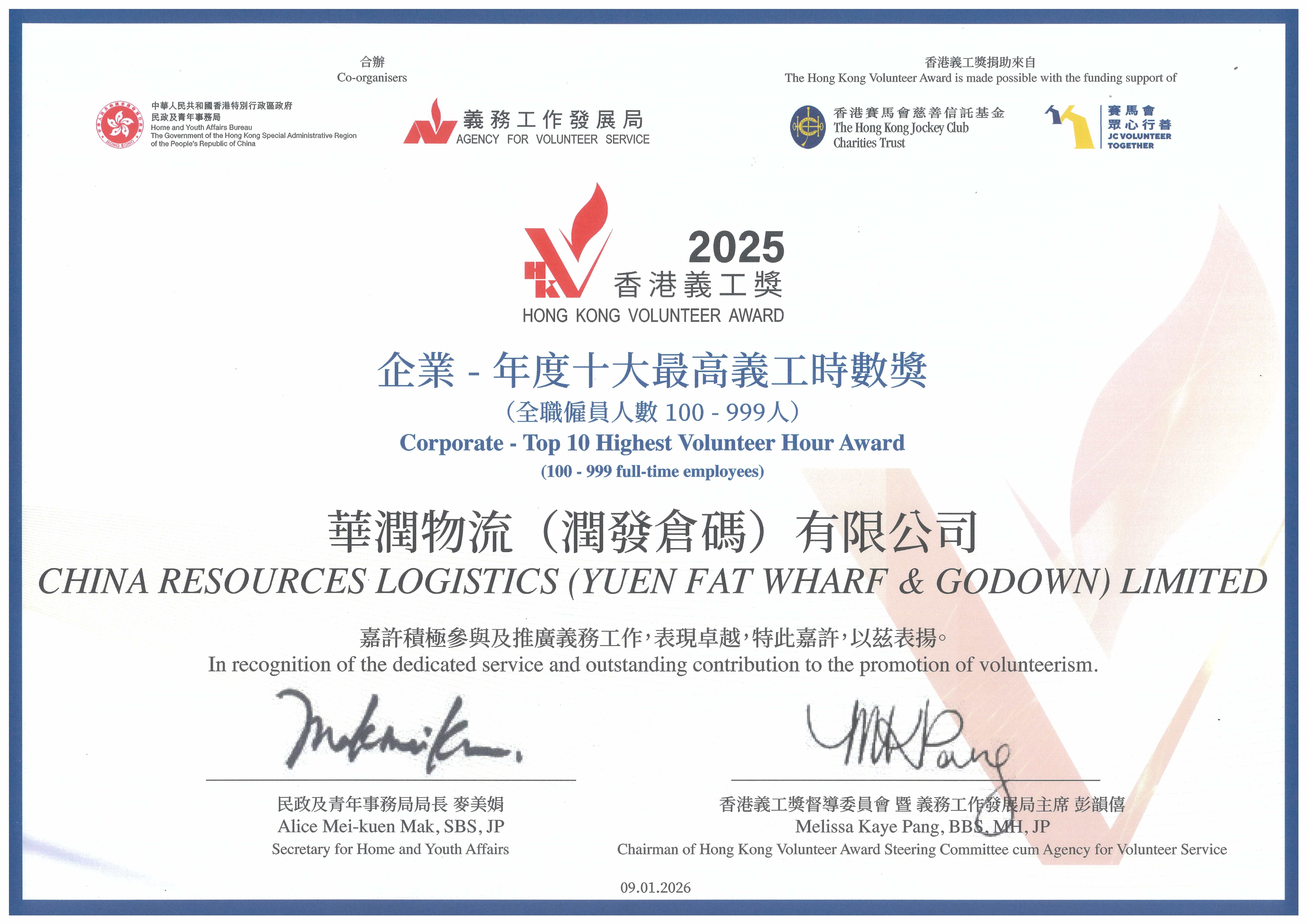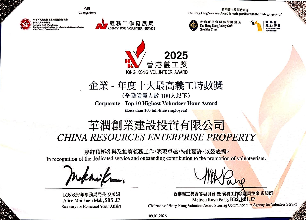 1月10日,由香港特区政府民政及青年事务局与义务工作发展局联合主办的“香港义工奖2025”颁奖典礼在港举行。华润物流荣获“企业-年度十大最高义工时数奖(全职雇员人数100-999人)”和“企业-义工时数优异奖”,华创建投获颁“企业-年度十大最高义工时数奖(全职雇员人数100人以下)”和“企业 - 义工时数铜奖”。