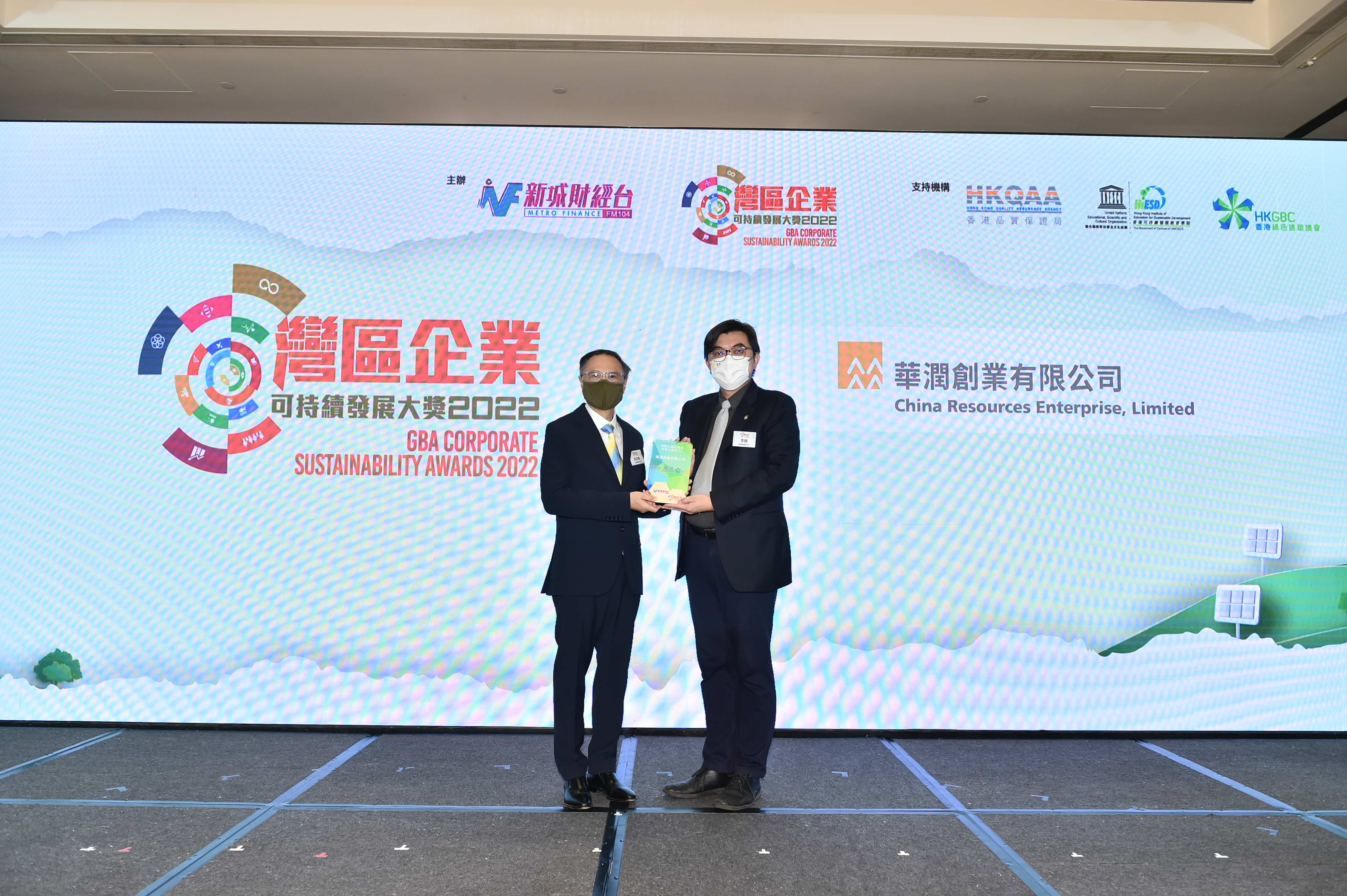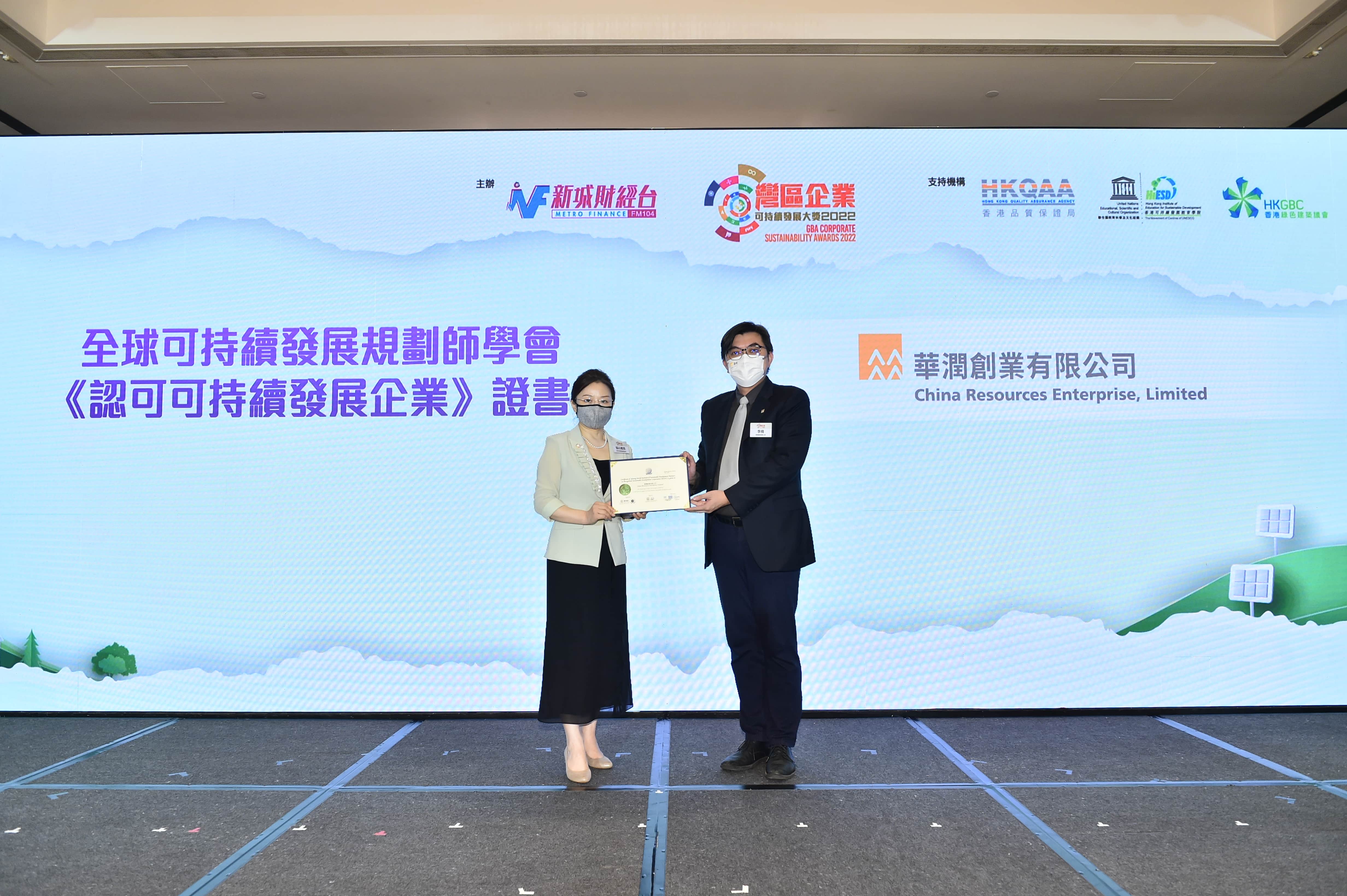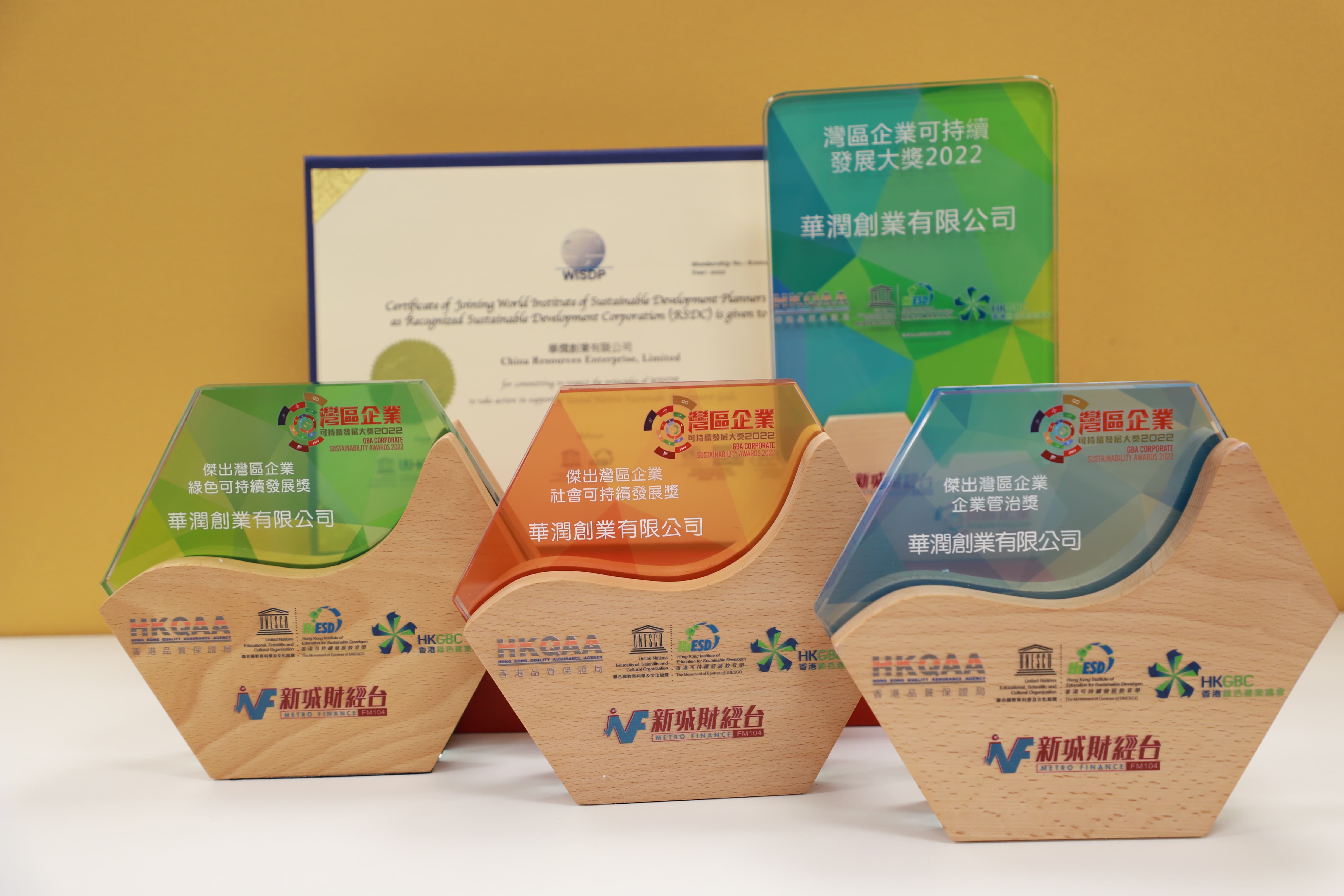《湾区企业可持续发展大奖 2022》主要分为社会可持续发展奖、绿色可持续发展奖及企业管治大奖三大类别,华润创业分别摘得“杰出湾区企业-社会可持续发展奖”(产业、创新和基础设施)、“杰出湾区企业-绿色可持续发展奖”(气候行动)和“杰出湾区企业-企业管治大奖”,获得全球可持续发展规划师学会(WISDP)颁发的《认可可持续发展企业》证书,该学会由联合国教科文组织(UNESCO)和香港可持续发展学院(HiESD)共同监督。