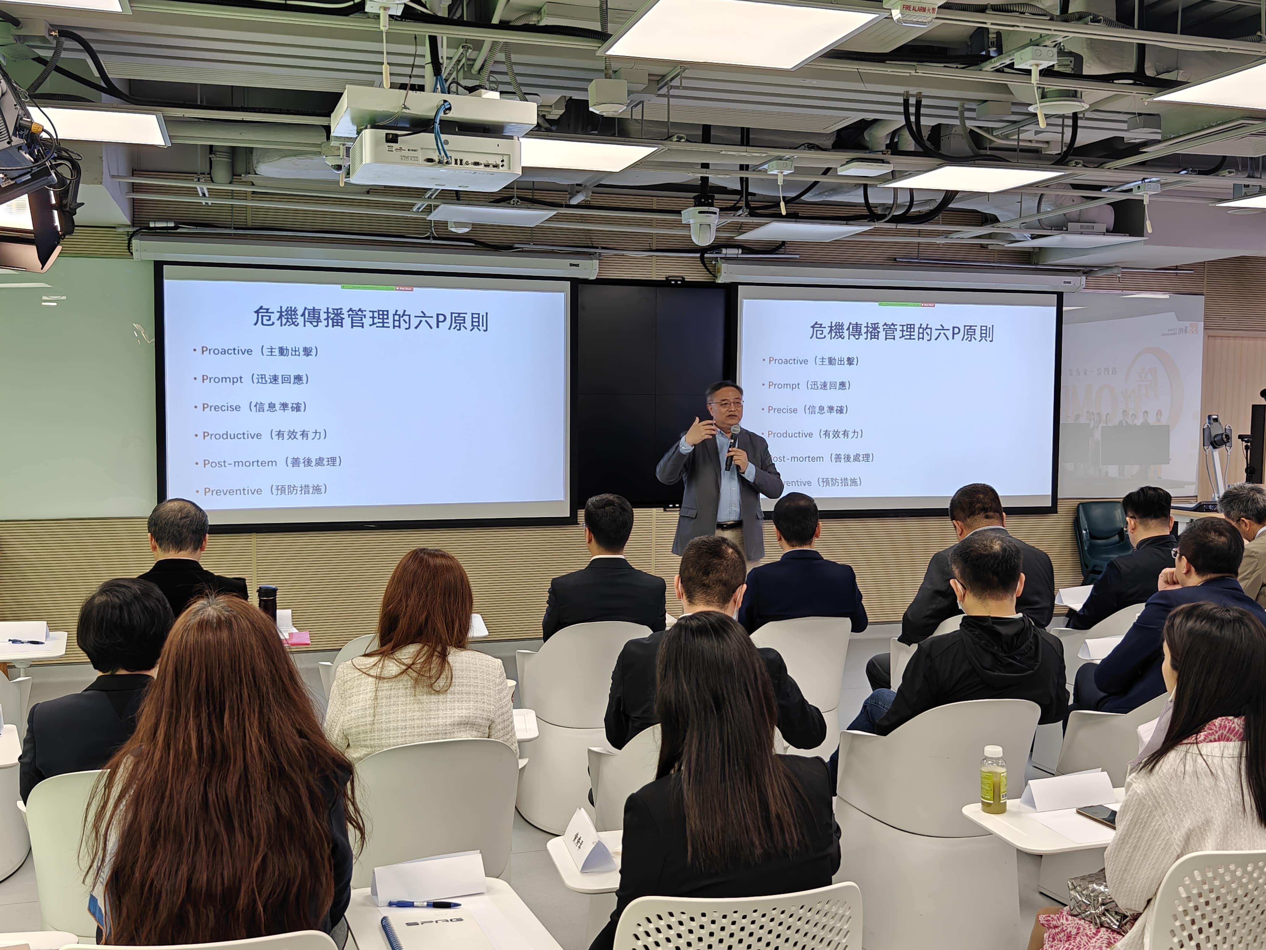 此次培训选择在曾入选全球十大新闻学院之一的香港浸会大学传理学院举办,由浸大传理学院新闻系主任李文教授、客座高级讲师张少威和前《信报》总编辑陈景祥教授授课。华创副总裁冯凯做导入发言,他表示希望通过培训提升各类新闻发言人在实际应用场景下对外发布新闻和应对负面舆情的处置能力。