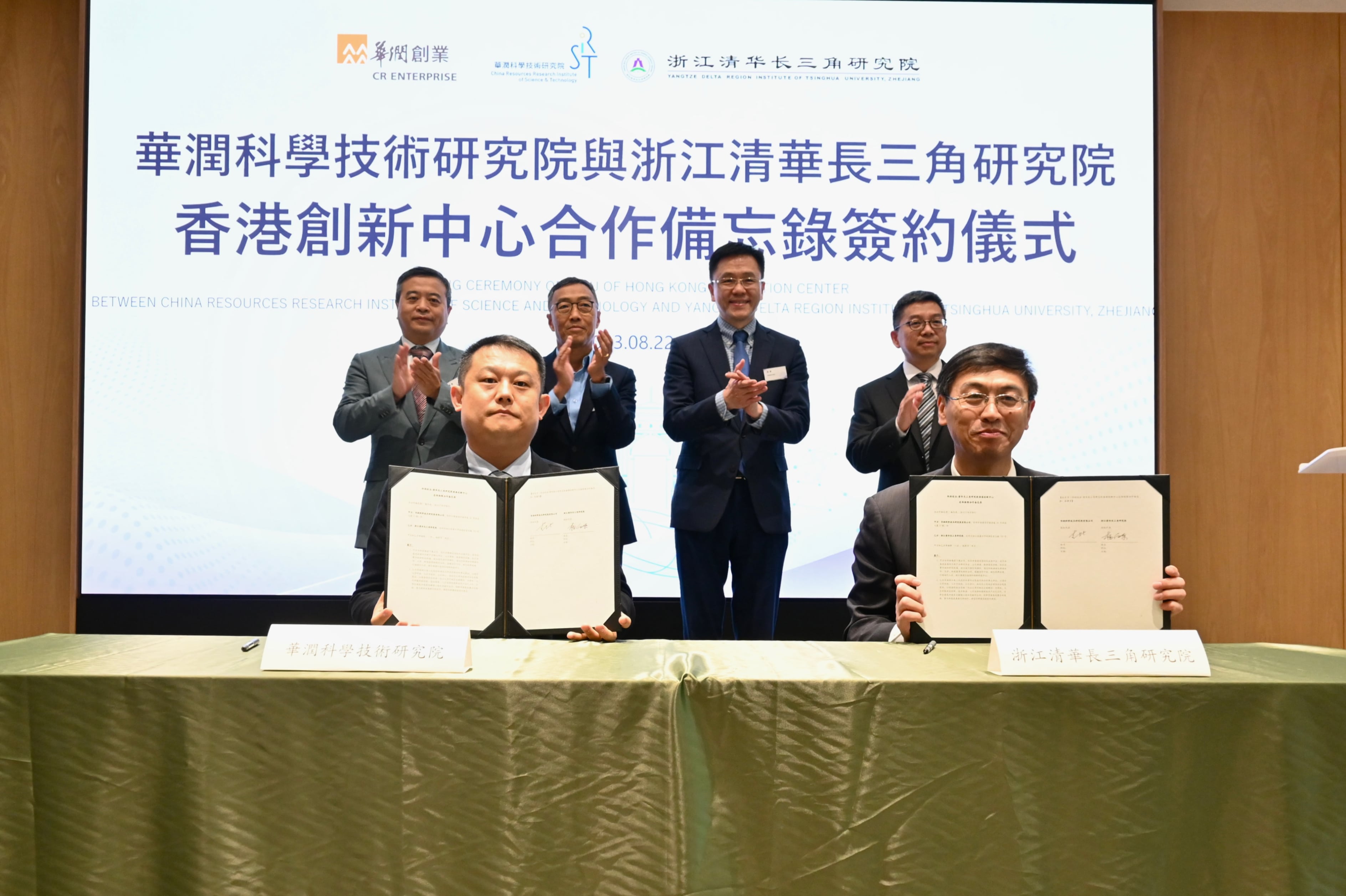 框架合作备忘录由浙江清华长三角研究院副院长杨向东及华润创业副总裁和华润科学技术研究院常务副院长支喆签署,香港创新科技及工业局局长孙东、香港科技园公司首席执行官黄克强、浙江清华长三角研究院院长黄开胜及华润集团助理总经理、华润创业董事长兼华润科学技术研究院院长陈鹰共同见证。双方决定联合聘用首席科学家,牵头和负责香港创新中心的研发任务。当日,由华润创业总裁王彦向受聘专家颁发了聘用证书。