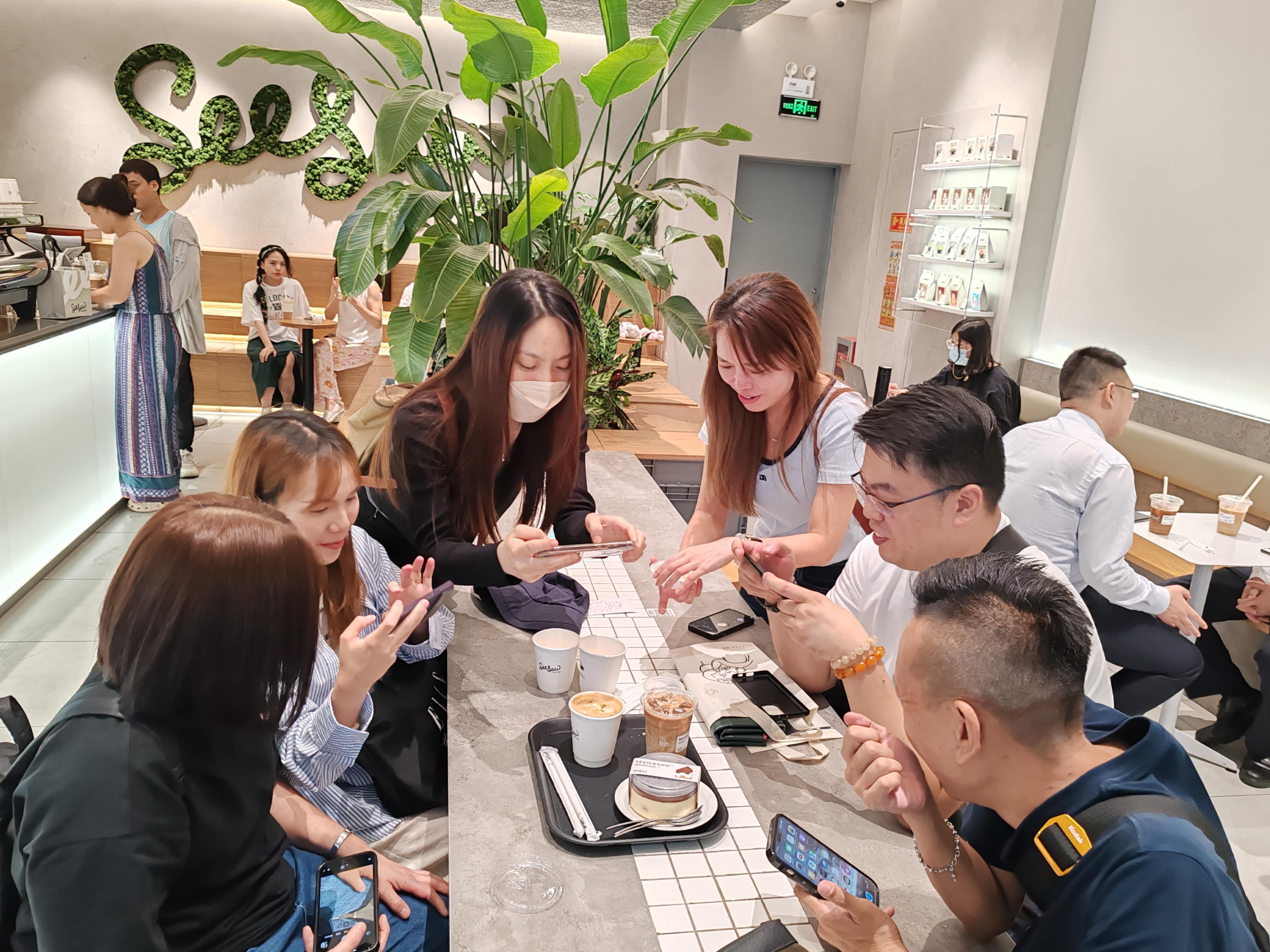 随后,太平洋咖啡内地员工带领香港员工分组前往深圳六大商圈35家商铺开展调研。大家一起来到首届“冲出梦想”计划优胜者团队运营的All day club店内参观交流,了解华创履行社会责任帮助香港青年创新创业的品牌活动。几位港青合伙人分享了在大湾区创业的心得体会,与太平洋咖啡香港员工深入交流了关于两地饮品市场的看法。