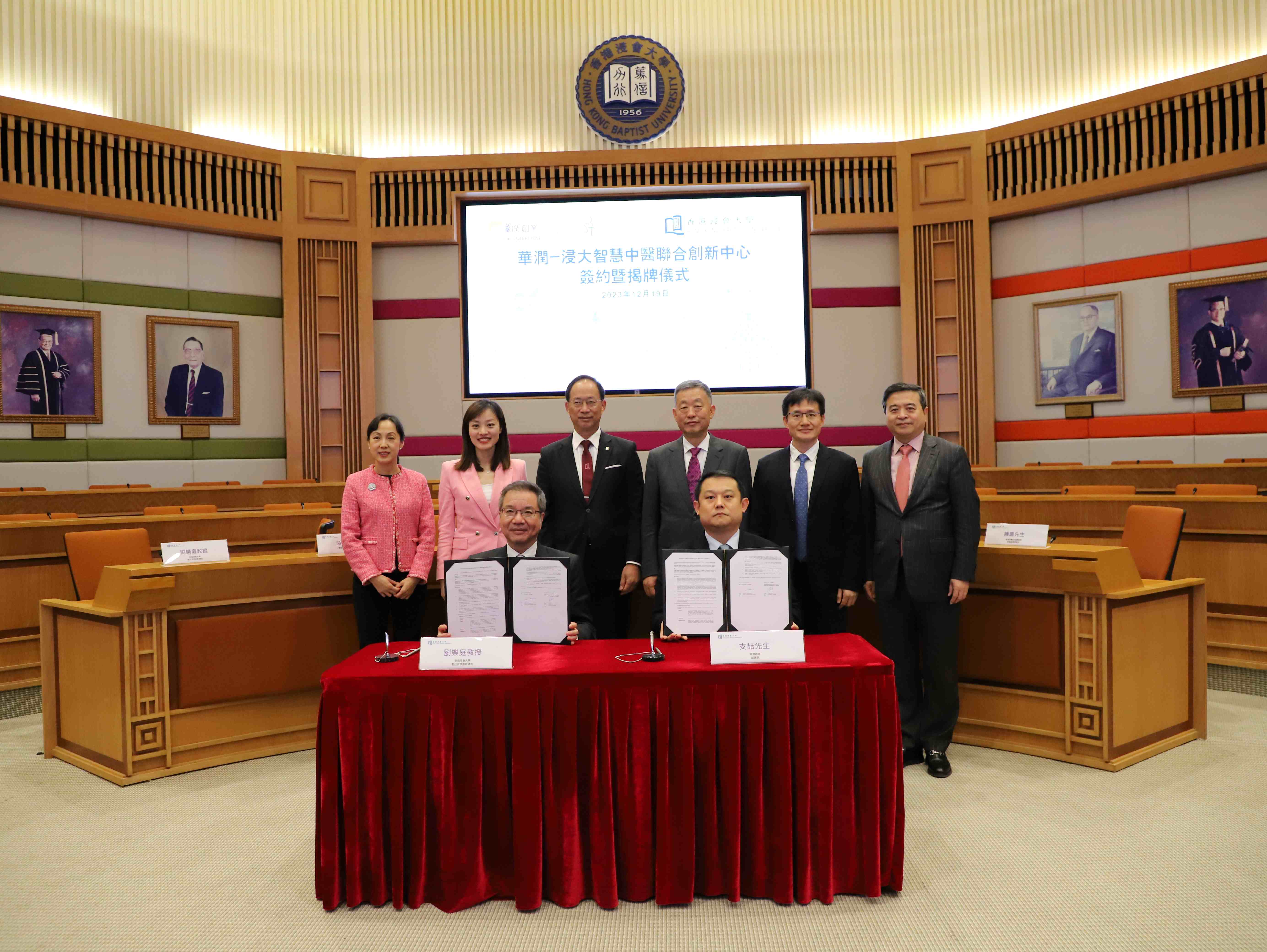 在华润集团董事长王祥明、香港中联办教育科技部王伟明部长、吴程副部长、香港创新科技及工业局张曼莉副局长、香港浸会大学校长卫炳江教授、华润集团助理总经理、华创董事长陈鹰共同见证下,华创副总裁兼华润科学技术研究院常务副院长支喆和浸大暂任首席创新总监刘乐庭教授签署。另邀请到华创董事及总裁王彦、浸大副校长(研究及拓展)吕爱平教授和行政副校长暨秘书长邹霭云参与揭牌仪式。